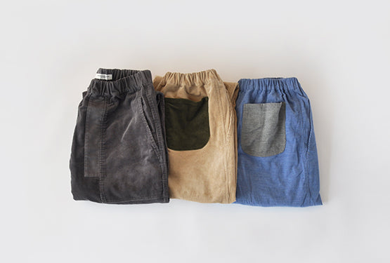 デザイン・シルエット後ろポケットの切替えがワンポイントのデザイン。 深い股上でヒップまわりをゆったりととりながら、 フロントの裾をダーツで絞ることで、 前後はふんわり、横はシャープに見えます。 全体のバランスがよく見えるバルーンシルエットです。生地・素材14ウェルのストレッチコーデュロイを使用。 パンツではポピュラーな中畝のコーデュロイです。 綿98%・ポリウレタン2%の混紡素材ですので、 柔らかさとハリの両方があって、 生地表面に起毛した凹凸があることで 保温性が高くシルエットと履き心地をキープします。 *14ウェル:コーデュロイの畝が1インチ間に14本あることを表したもの コーディネートチェックの6ギャザーシャツを合わせています。 <関連するNEWS> 履き心地で選ぶコーデュロイ(2025.12.27) 品番・色柄:HDA944-BE(ベージュ) HDA944-KHG(カーキグリーン)素材(本体):綿98%/ポリウレタン2%素材(別布):綿100%ウエスト:総ゴム仕様ポケット:左右前斜めポケット、右後パッチポケットスタイル:バルーンシルエット/一重仕立て洗 濯:洗濯機で水洗い可能(中性洗剤使用・単独洗濯)ドライクリーニング可能/アイロンは低温で使用 原産国:日本 重 量:553g